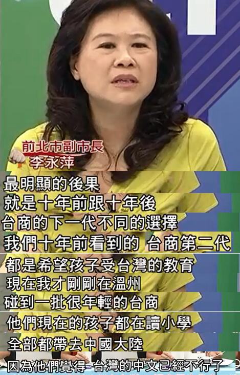 前台北市副市長李永萍更以親身經歷講述了近十年來台商對於下一代教育的不同選擇:如今年輕台商的孩子都在大陸學習,因為他們覺得台灣的中文教育已經不行了。