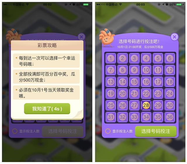 10月1日20:30前,通過擲骰子方式,每次到達遊戲地圖中的“投注”格子就能觸發36選1遊戲,玩家可從1-36個號碼中選擇任意一個不重複的號碼進行投注,但需要登錄高德地圖後方能投注成功。在10月1日21:00公佈開獎結果後,用户便可在口袋頁面查看中獎情況,所有中獎用户可瓜分高德地圖豪氣送出的500萬現金,聽起來是不是特別震撼?