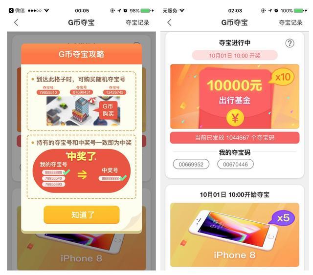 積攢了豐厚的G幣之後能做什麼?當然是購買奪寶號來參與奪寶遊戲。玩家每次出發G幣奪寶玩法後,可用1萬G幣兑換當期奪寶獎品的一個奪寶號。在10月1日開獎時,高德地圖會根據既定規則開出中獎號,持有中獎號的用户即能獲得該期獎品。為此高德地圖特別為玩家準備了iphone 8、米家掃地機器人、美圖手機等獎品。