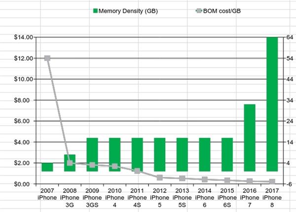 iPhone 3G容量翻番到8GB,每GB成本驟降到2美元,此後就延續了這種容量變大、成本降低的趨勢,到今天的iPhone 8 64GB,每GB已經只要區區0.22美元。