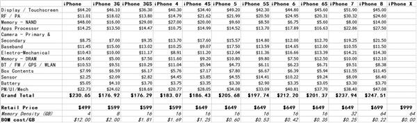 外媒就此總結了一張詳細的表格,列舉了歷代iPhone(未計入Plus版)的各個元件成本和總成本、零售價,以及閃存存儲的容量和單位容量成本,具體如下: