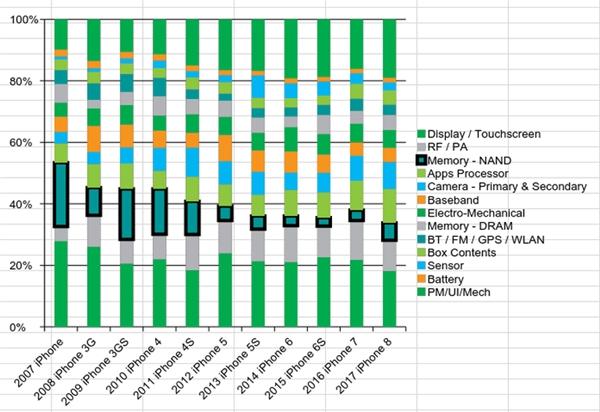 其實在iPhone的各種零部件中,大部分的成本一直都是比較穩定的,只有內存和閃存波動較大,而後者一直是iPhone版本劃分的依據。
