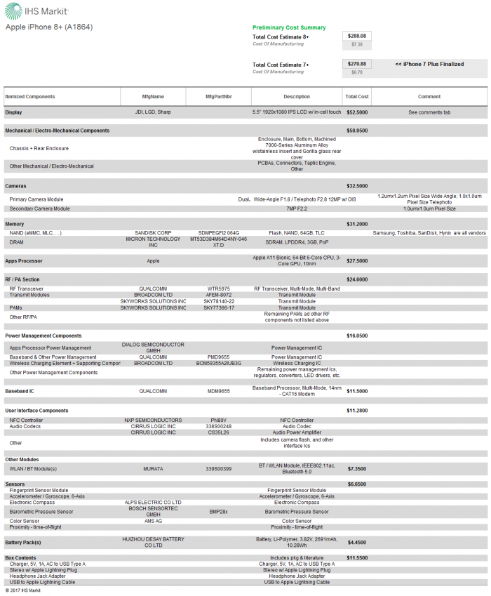 每次新的iPhone發佈之後,大家津津樂道的一個話題就是成本和利潤問題,然後感慨蘋果太暴利了,不愧是掘走行業90%利潤的JS。市調機構IHS按照慣例拆解分析了iPhone 8、iPhone 8 Plus,發現它們的BOM物料成本分別為247.51美元、288.08美元,相比於iPhone 7、iPhone 7 Plus分別高了9.57美元、17.20美元。