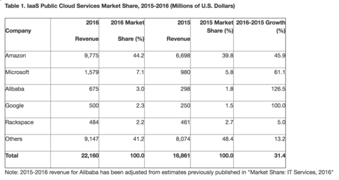 文章引述Gartner報告稱,2016年阿里雲IaaS營收達到了6.75億美元,增速達到了126%。全球雲計算“3A”(亞馬遜AWS、微軟Azure和阿里雲Alibaba Cloud)引領公共雲市場,三者佔據市場份額前三位,亞馬遜保持領先優勢,中國雲計算領頭羊阿里雲超越Google,緊追第二位微軟Azure。