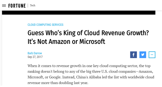 9月28日,美國知名財經媒體《財富》引述Gartner最新發布的全球雲計算市場份額報告稱,過去一年全球雲計算三大巨頭中,增長最快的不是亞馬遜和微軟,而是來自中國的阿里雲。Gartner稱,全球3A陣營引領市場,其中阿里雲規模增長最快,在中國市場具有統治地位,並積極拓展國際市場。
