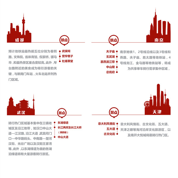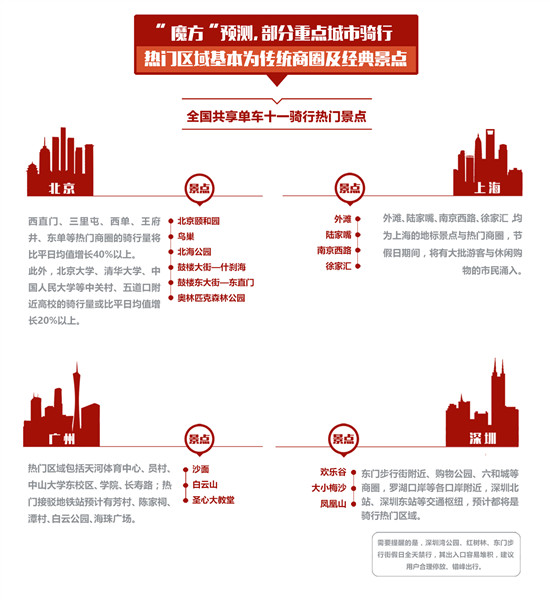 “魔方”預測,部分重點城市騎行熱門區域基本為傳統商圈及經典景區: