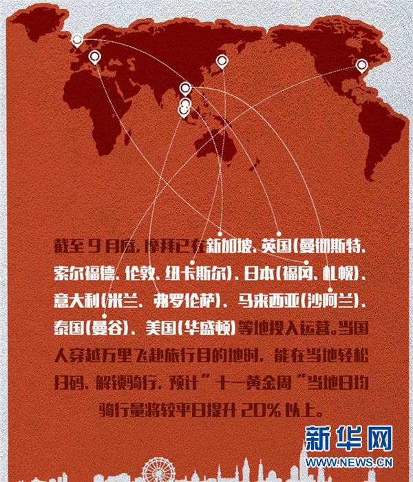 截至9月底,摩拜已在新加坡、英國(曼徹斯特、索爾福德、倫敦、紐卡斯爾)、日本(福岡、札幌)、意大利(米蘭、弗羅倫薩)、馬來西亞(沙阿蘭)、泰國(曼谷)、美國(華盛頓)等地投入運營。當國人穿越萬里飛赴旅行目的地時,能在當地輕鬆掃碼、解鎖騎行,預計“十一黃金週”當地日均騎行量將較平日提升20%以上。