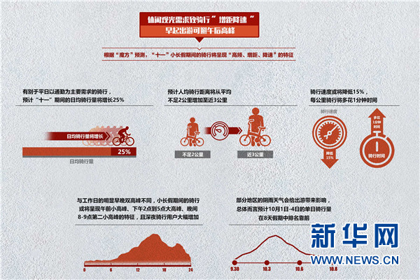 根據“魔方”預測,“十一”小長假期間的騎行將呈現“高頻、增距、降速”的特徵: