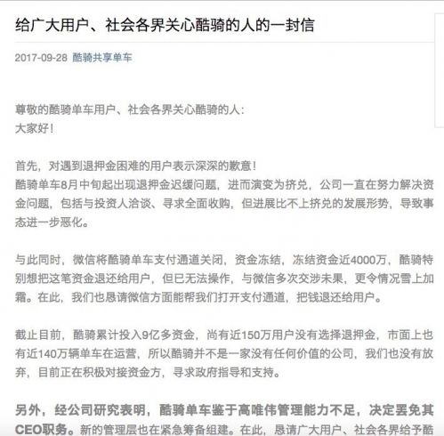 “在此,我們也懇請微信方面能幫我們打開支付通道,把錢退還給用户。”酷騎單車表示,微信將酷騎單車支付通道關閉,資金凍結,凍結資金近4000 萬,酷騎特別想把這筆資金退還給用户,但已無法操作,與微信多次交涉未果,更令情況雪上加霜。