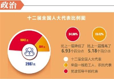 十二屆全國人大代表中,來自一線的工人、農民代表比上一屆提高了5.18個百分點。