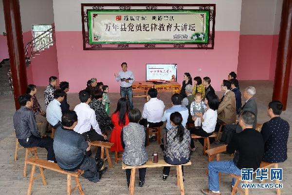 江西省上饒市萬年縣陳營鎮馬塘社區紀檢監察干事黃中華在為黨員和羣眾做題為“把紀律挺在前面”的專題宣講(2015年10月28日攝)。新華社記者 萬象 攝