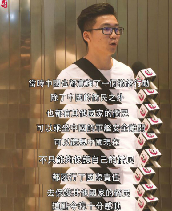 陳承恩還特別關注了電影的細節指出,“有其他國家的僑民上了中國軍艦安全離開,體現中國不僅能夠保護自己的僑民,還能夠履行國際責任,保護其他國家的僑民,這點令人十分感動。”