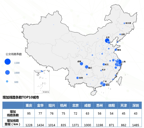 報告顯示,2017年上半年我國主要城市的公交線路總長度達到了55.9萬公里,相比2016年增加了3萬公里,總里程是全國高速公路的4倍,其中北京、上海、廣州、重慶、深圳、成都、杭州、蘇州8座城市公交線路均超過了1000條,北上廣分別以1730、1574、1367條公交線路及4.09、2.56、2.62萬公里線路里程,位列全國公交線路規模的前三名。