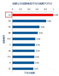 報告通過線路客流不均勻指數對成都進行分析,按指數的大小分為四個等級,等級(值)越大代表該線路在各個站點客流分佈越不均勻,越有必要對線路進行進一步的分析及優化。15路線路客流不均勻指數高達0.99,排名第一。