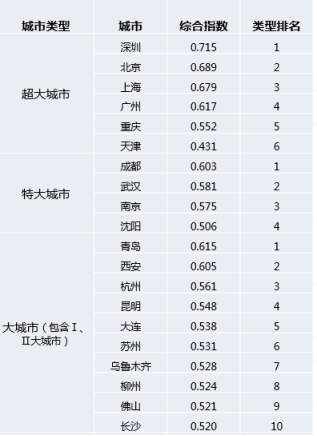 通過對於動態指標、公交基礎指標、軌道基礎指數等三類指標7個小項加權得出綜合指數對目前82個城市的公共交通出行進行了服務指數排名。深圳以0.715的公共出行服務指數排名全國第一,深圳在站點500米覆蓋率、軌道銜接、公交開放水平方面表現優異。其次是北京和上海。