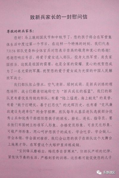 “寶劍鋒從磨礪出,梅花香自苦寒來”。但部隊嚴明的紀律,緊張快節奏的生活,嚴格刻苦的訓練,這些都可能促使您的兒子出現想家的念頭。我們真誠的希望,當您的兒子有想家和出現怕苦怕累的想法時,請您及時給予勸勉和鼓勵,幫助我們共同做好思想教育和正面引導工作。對於您的支持和幫助,我們代表73156部隊黨委和全體官兵向您深表敬意。