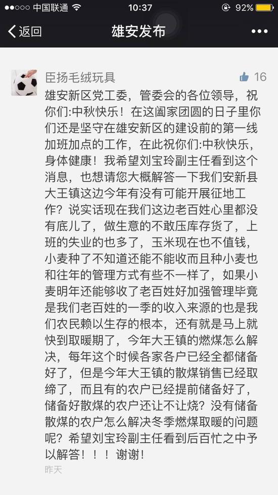 10月4日晚,在“雄安發佈”最新一篇文章下面,有網友留言提出了一些大家關心的問題,並“點名”希望雄安新區黨工委副書記、管委會常務副主任劉寶玲能夠解答一下。5日一大早,劉寶玲的解答就發到了“雄安發佈”的留言區。雖説只是簡單的一問一答,但網友的問題具有代表性,新區領導的回答也是實實在在、乾貨滿滿,讓大家吃了顆定心丸,消除了原來的擔心。