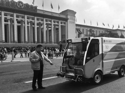 和他一起的,還有5輛清掃車、5輛廁所車和150名環衞保潔人員。在升旗前,保潔員將對天安門廣場進行“拉網式”清掃。