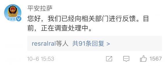 下午17時許,拉薩網警通報該事件引起了拉薩市公安局高度關注,目前正在全力調查此事,請廣大網民稍安勿躁,靜待結果。