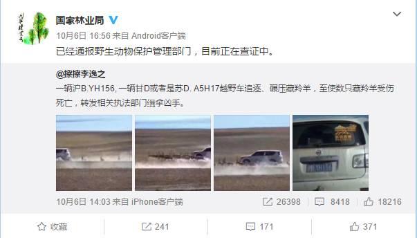 10月6日,一則*“兩輛外地牌號的越野車在西藏追逐碾壓藏羚羊”*的消息在微信朋友圈廣泛傳播。有網友稱,車輛在追逐過程中致數只藏羚羊死亡。