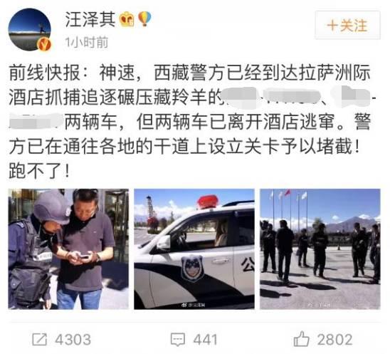 10月6日下午14時許,有網友在新浪微博上發佈“越野車追逐碾壓藏羚羊”一事。拉薩市公安局得知這一消息後高度重視,市局網安支隊派遣精幹警力就此事展開調查,並於當日下午17時許,聯合森林公安成功將兩輛涉案車的7名乘員控制,並找到藏匿車輛。目前,警方正對7人進行調查審理。