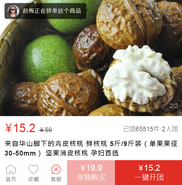 在依託推薦和分享的拼多多營銷體系的助力下,這款由華陰市岳廟辦苗家村村民們種植、採摘的鮮核桃,以秒殺引流取得的8分鐘900單的開門紅之後,人氣勢如破竹,上線僅4天,就售出了5萬斤。呼朋喚友“拼着買”,讓許多人第一次接觸到美味健康的鮮核桃,僅僅一個月的時間裏,“來自華山腳下的青皮核桃”已在拼多多累計銷售了70多萬斤。