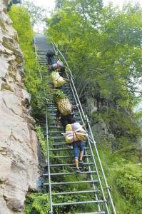 藤梯變鋼梯之後,每天,行走在2550級鋼梯上的人,除慕名而來的外地人,還有一羣新職業人的身影:背夫。這些背夫,都是懸崖村的小夥子,他們靠為人背東西上山賺取收入。