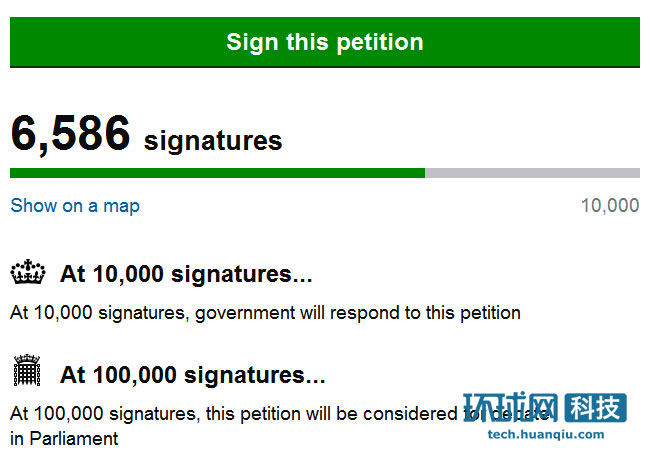 截止環球網科技記者發稿前,已有6586人加入請願;網站顯示,當有10000人次請願時,政府會回應這項請願;當有100000人次請願後,這項請願會在議會正式商討。據悉這項請願將會在2018年4月4日截止,還有六個月的時間。