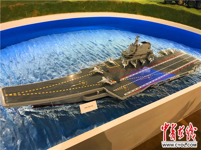 2017年4月26日,我國第二艘航空母艦在拖曳牽引下緩緩移出船塢,停靠碼頭。這一刻,標誌着我國自主設計建造航空母艦取得重大階段性成果。在展區正中央的“強軍征程、揚帆遠航”主題模型展台上,我國第二艘航空母艦的模型吸引了很多軍事迷爭相拍照。