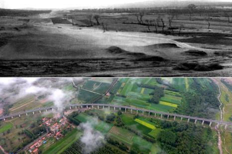 拼版照片:上圖為治理前的山西省右玉縣右衞鎮的景象(資料照片);下圖為現在山西省右玉縣右衞鎮一帶的景象(圖片來源:新華社)。