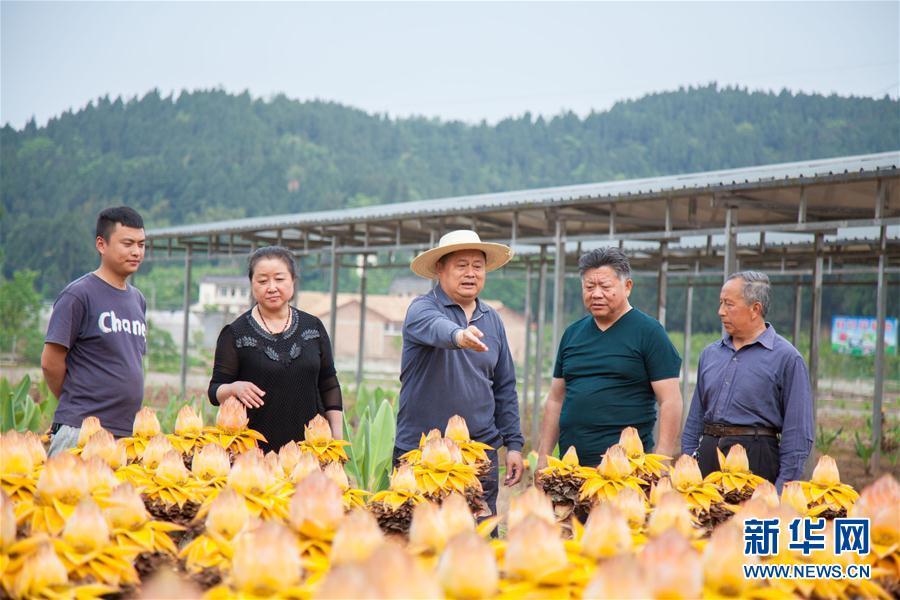 在四川蓬溪縣拱市村,蔣乙嘉(中)在為村民講解千葉佛蓮的生長習性(5月9日攝)。新華社發(蔣東宏 攝)