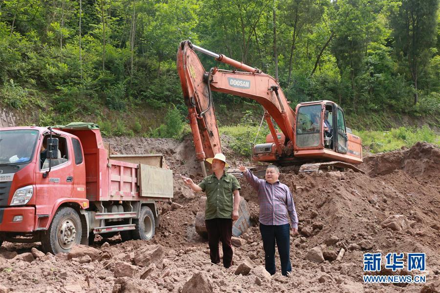 在四川蓬溪縣拱市村,蔣乙嘉(右)在新建的拱市聯村黨羣服務中心現場指揮施工(5月4日攝)。新華社發(蔣東宏 攝)
