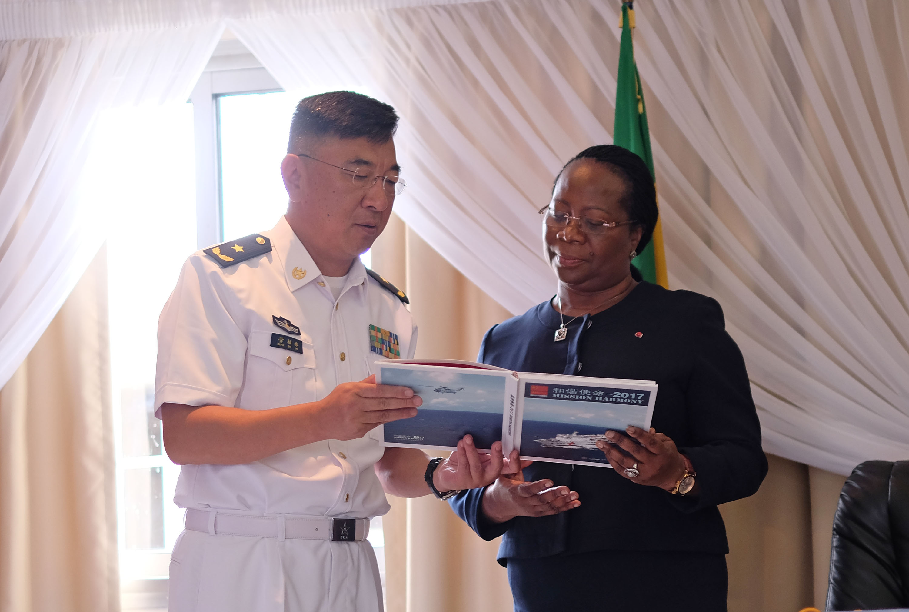 “和諧使命-2017”任務指揮員管柏林向加國務部長兼衞生部長丹尼絲•梅卡姆內贈送和諧使命宣傳畫冊。江山攝
