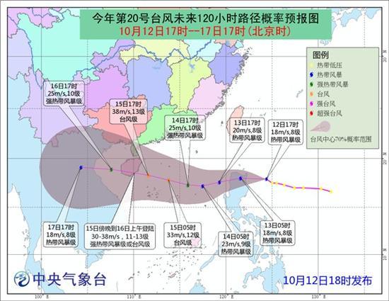 預計,颱風將以每小時25公里左右的速度向偏西方向移動,強度逐漸加強,今天晚上到明天上午穿過呂宋島北部後向偏西方向移動,強度繼續加強,最強可達強熱帶風暴級或颱風級(11-13級,30-38米/秒),爾後逐漸向我國海南島東部和廣東西部沿海靠近,並可能於15日傍晚到16日上午在這一帶沿海登陸(11-13級,30-38米/秒),也可能掠過海南島南部近海海面向越南北部沿海靠近。
