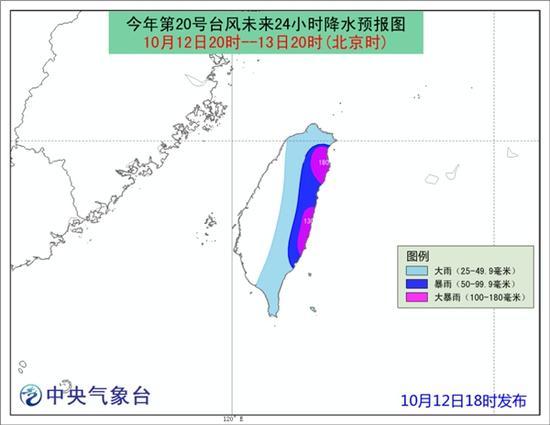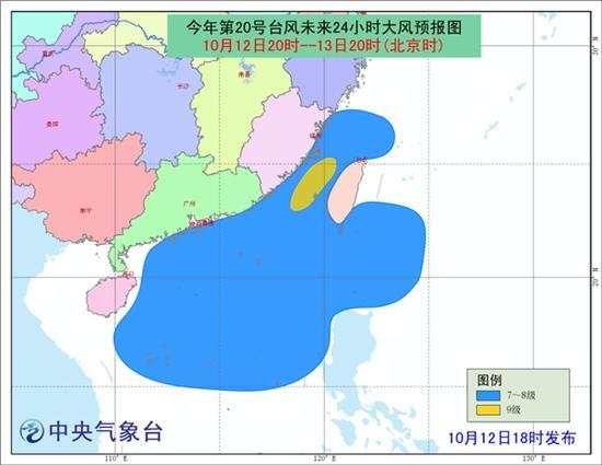 大風預報:12日20時到13日20時,受第20號颱風和冷空氣共同影響,台灣以東洋麪、巴士海峽、台灣海峽、南海中北部,以及台灣南部和西部沿海、廣東沿海、福建沿海將有7-8級大風,其中台灣海峽的部分海域風力有9級,陣風可達10-11級。