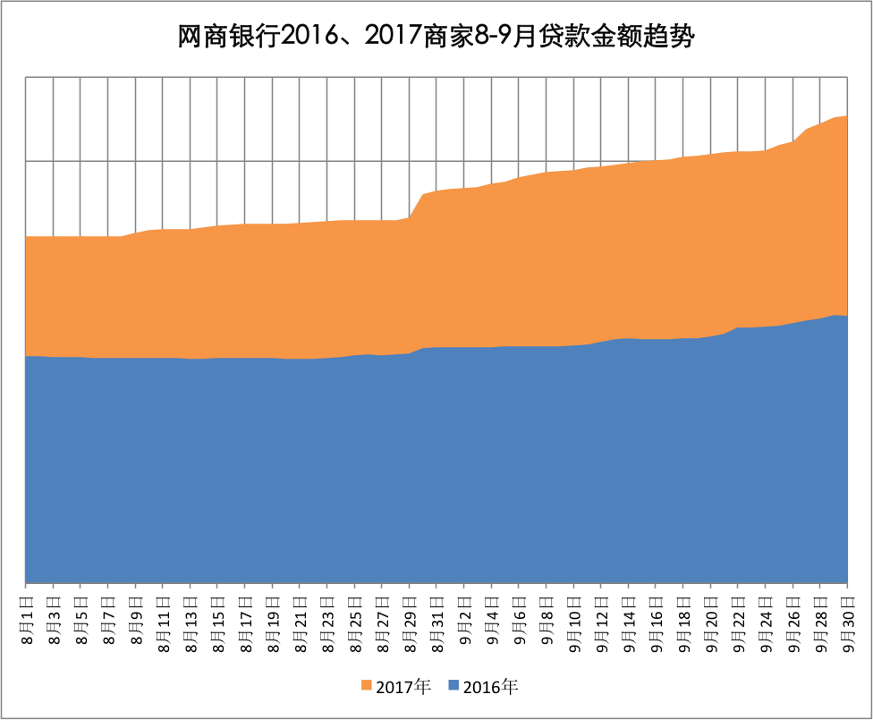 據瞭解,從今年8月開始,網商銀行就主動為天貓淘寶的商家提升了信用貸款額度,共有超過1000萬商家獲得了貸款授信,總提升額度超600億。網商銀行最新數據顯示,8、9兩個月天貓、淘寶平台商家的貸款用户數與去年同期相比增加了33%,貸款總額更同比增加了62%。
