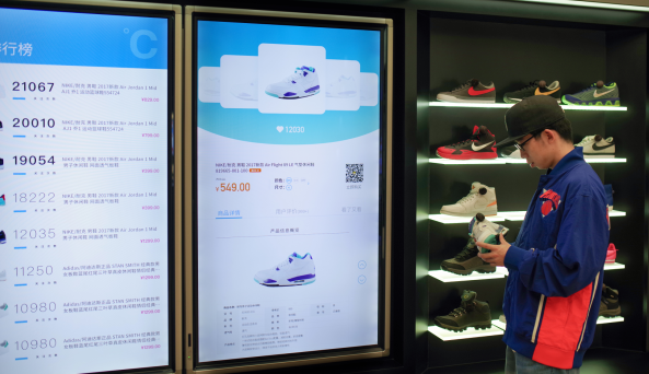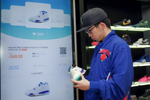舉例來説,一位顧客想買一雙運動鞋,當他拿起這雙鞋之後,旁邊的兩塊屏幕開始同步出現變化,一塊屏幕展示被觸動商品的視頻、文字介紹和歷史評價等顧客關心的信息。另外一塊顯示屏將會根據用户在選購過程當中的喜好,推薦幾款經過大數據分析及商品熱度分析後的運動鞋供用户進行選擇。