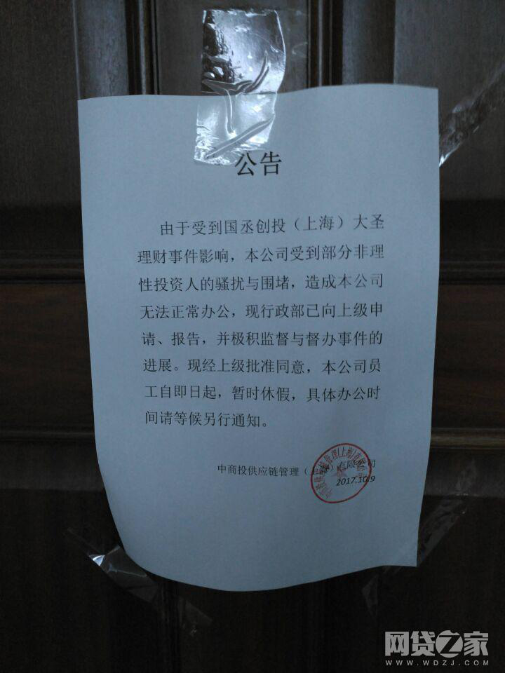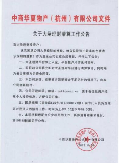 直到9月29日,大聖理財平台仍然處於提現困難狀態。而作為擁有大聖理財平台運營方國丞創投(上海)金融信息服務有限公司(以下簡稱“國丞公司”)90%股權的控股股東,中商華夏出事了《關於大聖理財清算工作公告》。承認了國丞公司大聖理財確實進行了清盤,對投資者進行道歉。