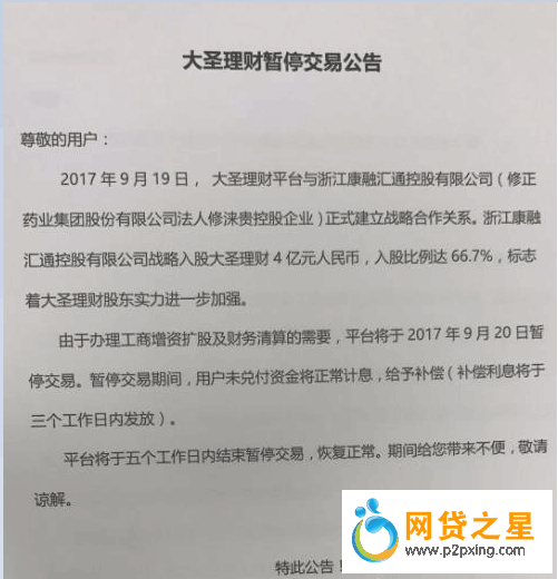 據網貸之星此前公佈的信息顯示,大聖理財於9月19日發佈的暫停交易公告表示,由於大聖理財平台與浙江康融匯通控股有限公司(修正藥業集團股份有限公司法人修淶貴控股企業)正式建立戰略合作關係。浙江康融匯通控股有限公司戰略入股大聖理財4億元人民幣,入股比例達66.7%。由於辦理工商增資擴股及財務清算的需要,平台將於2017年9月20日暫停交易,將於五個工作日內結束暫停交易,恢復正常。