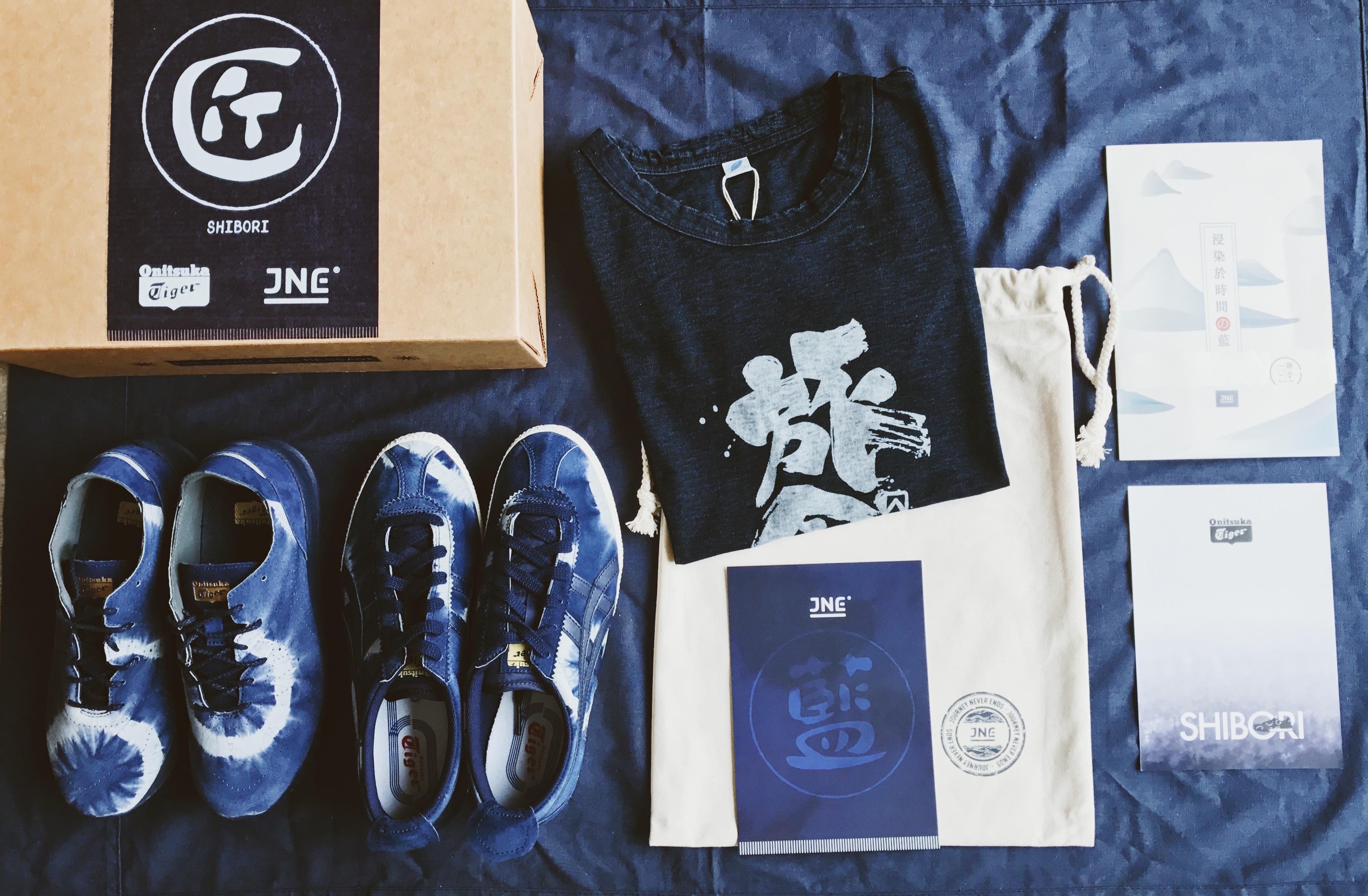 該禮盒包含JNE的「旅命」藍染T恤(木屐或摺扇款),以及來自一雙Onitsuka Tiger SHIBORI系列運動鞋(SAMSARA LO或MEXICO DELEGATION)。