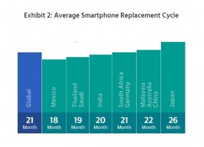 平均來説,全球用户每21個月更換一次手機,墨西哥平均只有18個月,而日本用户更換手機的時間達到了26個月。