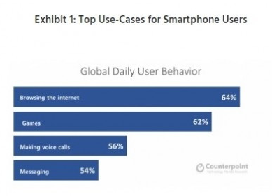 智能手機最常的功能是瀏覽互聯網,佔比為64%,其次是遊戲,佔比62%,撥打語音電話和發信信分別為55%和54%。
