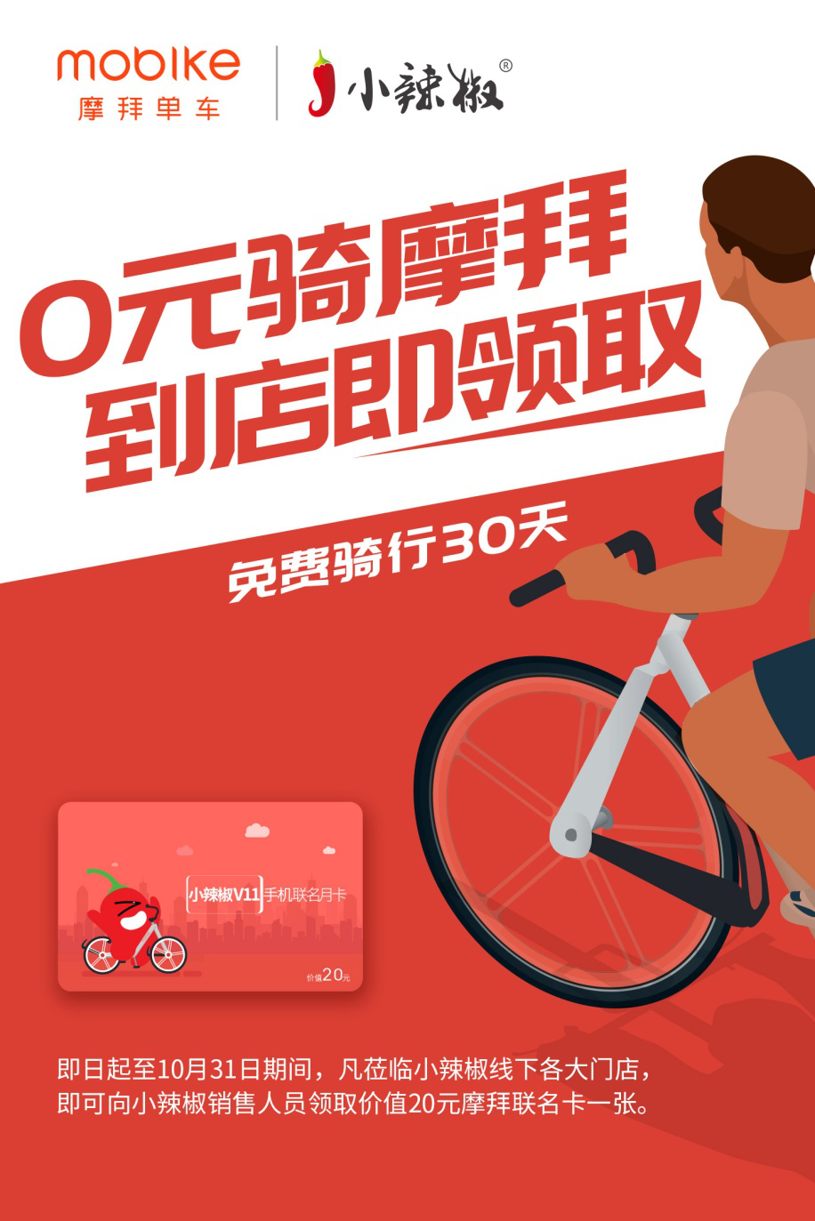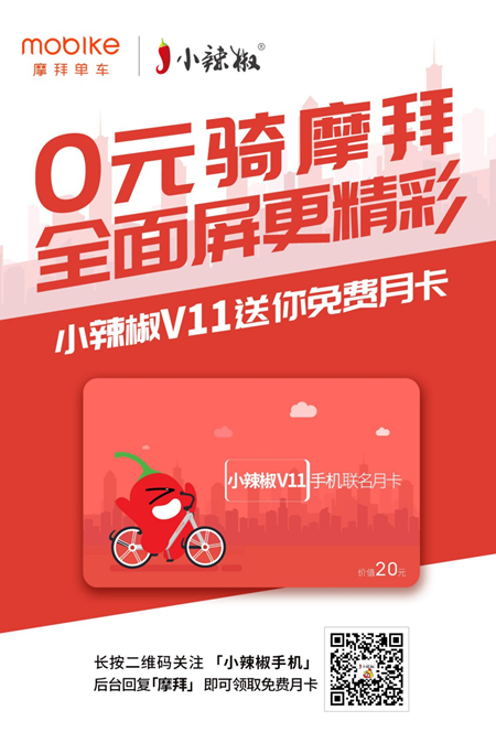 且從今年7月初,ofo小黃車和摩拜都相繼開始贈送免費月卡活動,截止到今年10月份聯名月卡活動進行的如火如荼。特別是近期,摩拜又搞出大動作,上週攜國產手機廠商小辣椒科技推出了聯名月卡活動, 即“0元騎摩拜 全面屏更精彩”領取小辣椒V11手機聯名月卡當日起30天內騎行免費。