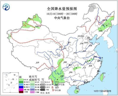 19日08時至20日08時,全國大部無降水。新疆西北部、黑龍江東部、吉林中東部、四川中部以及雲南等地的部分地區有小雨或陣雨。東海大部海域、台灣海峽、台灣以東洋麪將有6~8級、陣風9~10級的東北風。