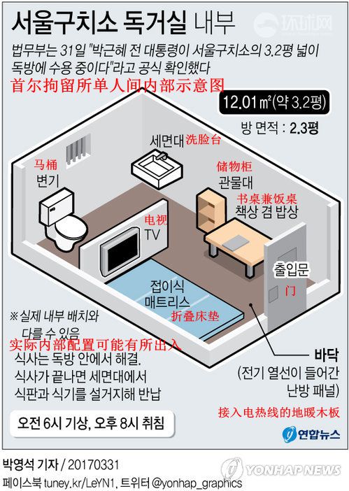 韓國法務部方面僅公佈,3月31日朴槿惠收押後“使用首爾拘留所的10.08平方米規模的單人間”。