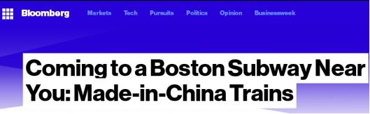當時,彭博社就發表了一篇題為《中國製造的列車即將成為波士頓地鐵,來到你身邊》的文章。文章稱,中國與波士頓交通管理局簽訂了5.67億美元的訂單,負責提供整個城市的地鐵車輛。這也是中國公司在美國拿下的第一筆列車訂單。