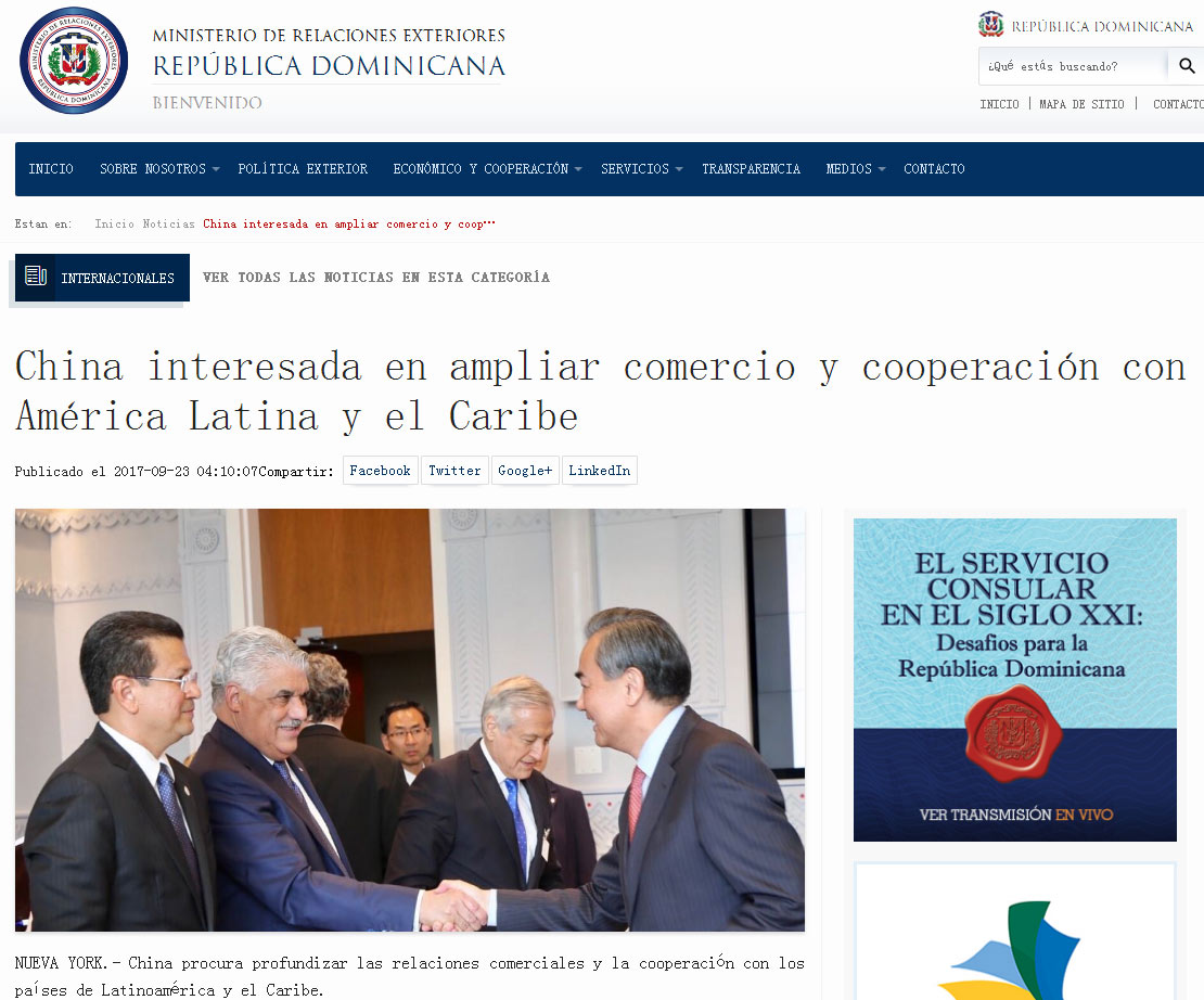 多米尼加外交部部長瓦爾加斯同中國外交部部長王毅握手(多米尼加外交部官網截圖)