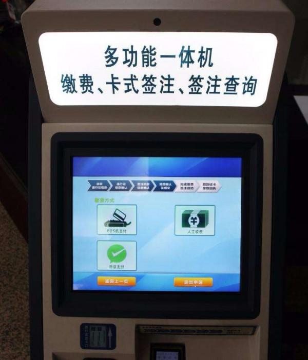北京市民通過出入境管理接待場所內的多功能一體機辦理出入境業務時,可選擇微信支付選項。市公安局供圖