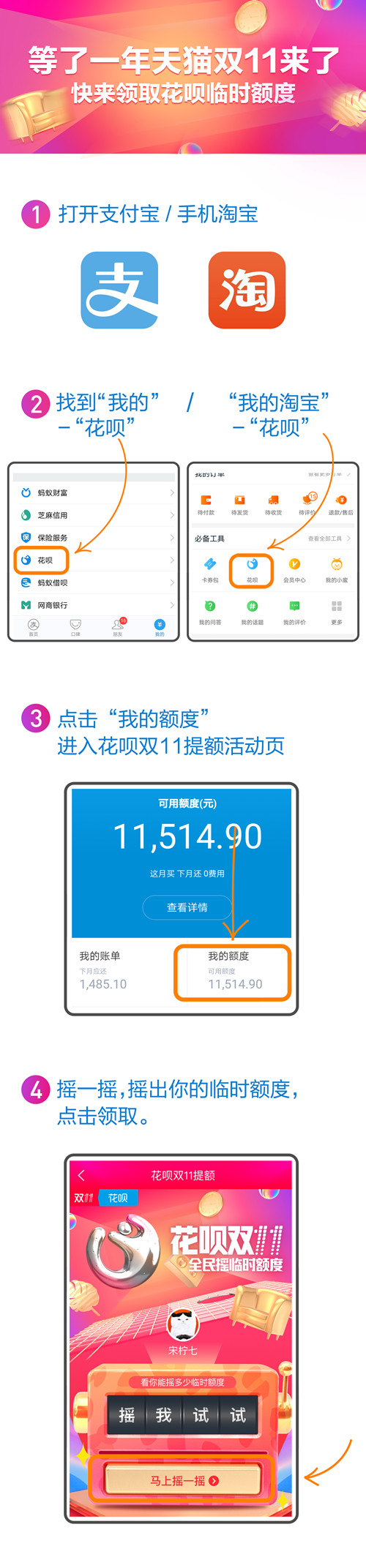 那麼,怎樣才能領取花唄臨時額度呢?從支付寶或者手機淘寶進入花唄,點擊“我的額度”就可以進入提額頁面,馬上搖一搖,就能夠搖出每個人的花唄天貓雙11臨時額度,點擊確認即可領取。這項活動將從即日起持續到11月7日。(李文瑤)