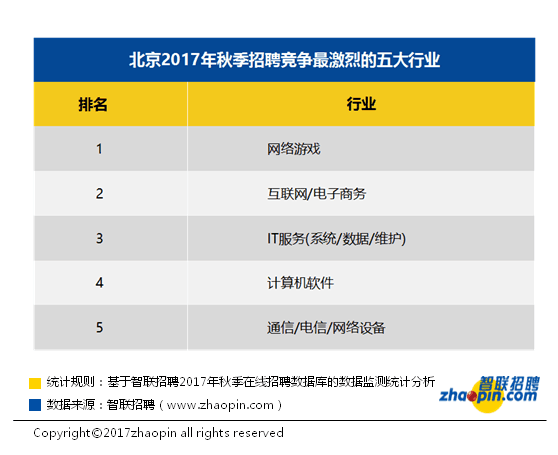 智聯招聘2017年秋季在線數據顯示,北京地區競爭指數排名前五位的行業中,網絡遊戲的競爭指數最高,其次是互聯網/電子商務行業,IT服務(系統/數據/維護)行業排在第三,計算機軟件行業和通信/電信/網絡設備行業的競爭指數位列第四和第五。隨着網絡技術的高速發展,作為互聯網經濟中重要分支的網絡遊戲產業的規模逐步擴大,該行業的人才需求越來越多,但由於行業門檻較高,就業競爭也非常激烈。近年來受益於國家政策的大力支持、互聯網用户規模的迅速擴大,電子商務、IT服務、計算機軟件等行業也駛上了飛速發展的快車道,吸引了大批求職者。